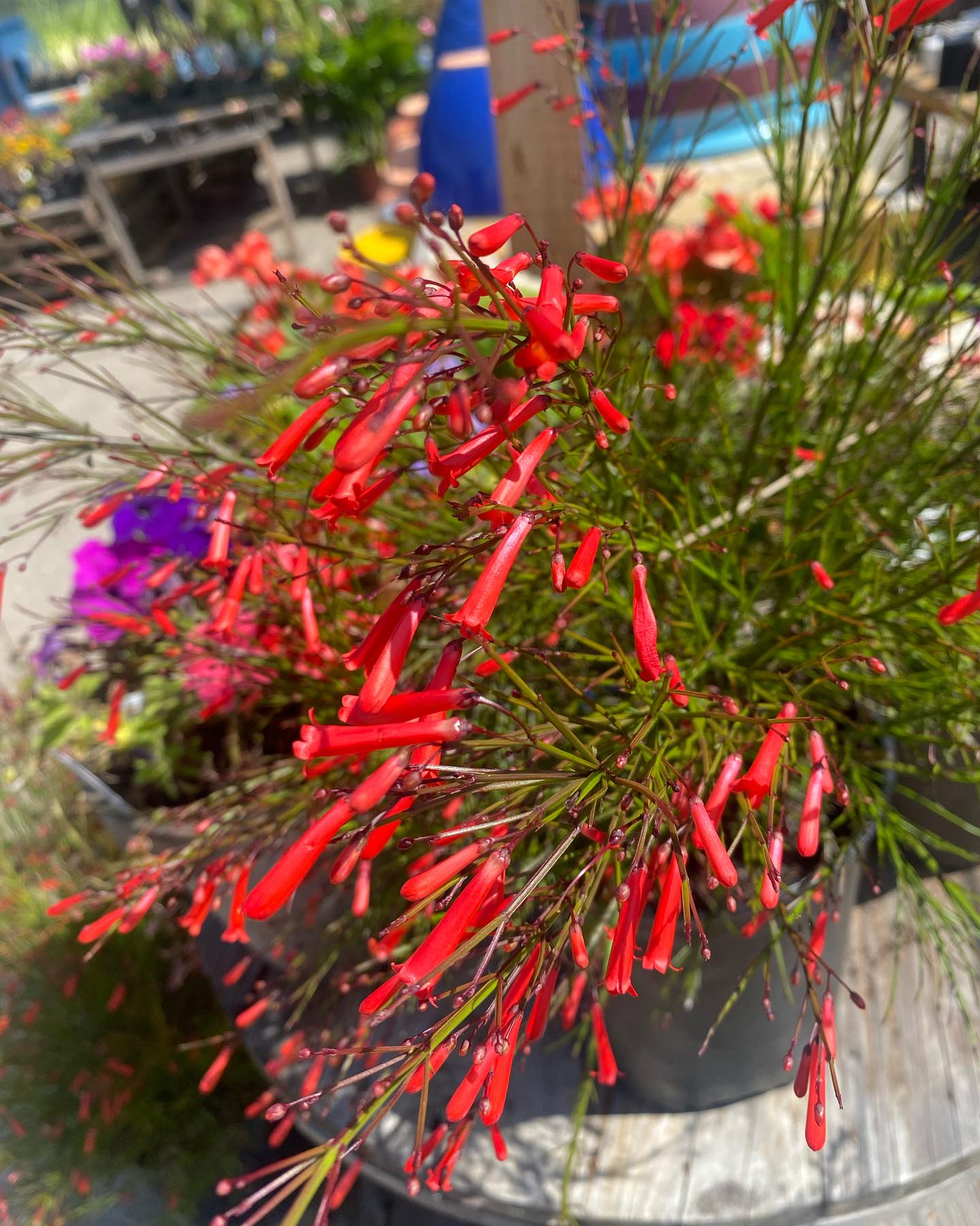 Cascading, trailing stems with vibrant red tubular flowers